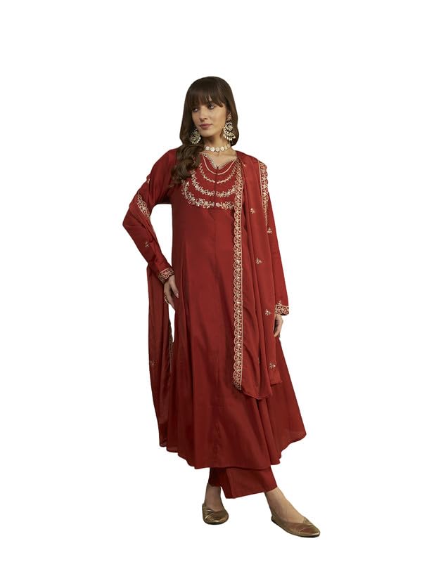 Honky Tonky Women’s Embroidered Anarkali Kurta Pant Dupatta Set | Silk Ethnic Suit with Heavy Neck Work & Bordered Dupatta